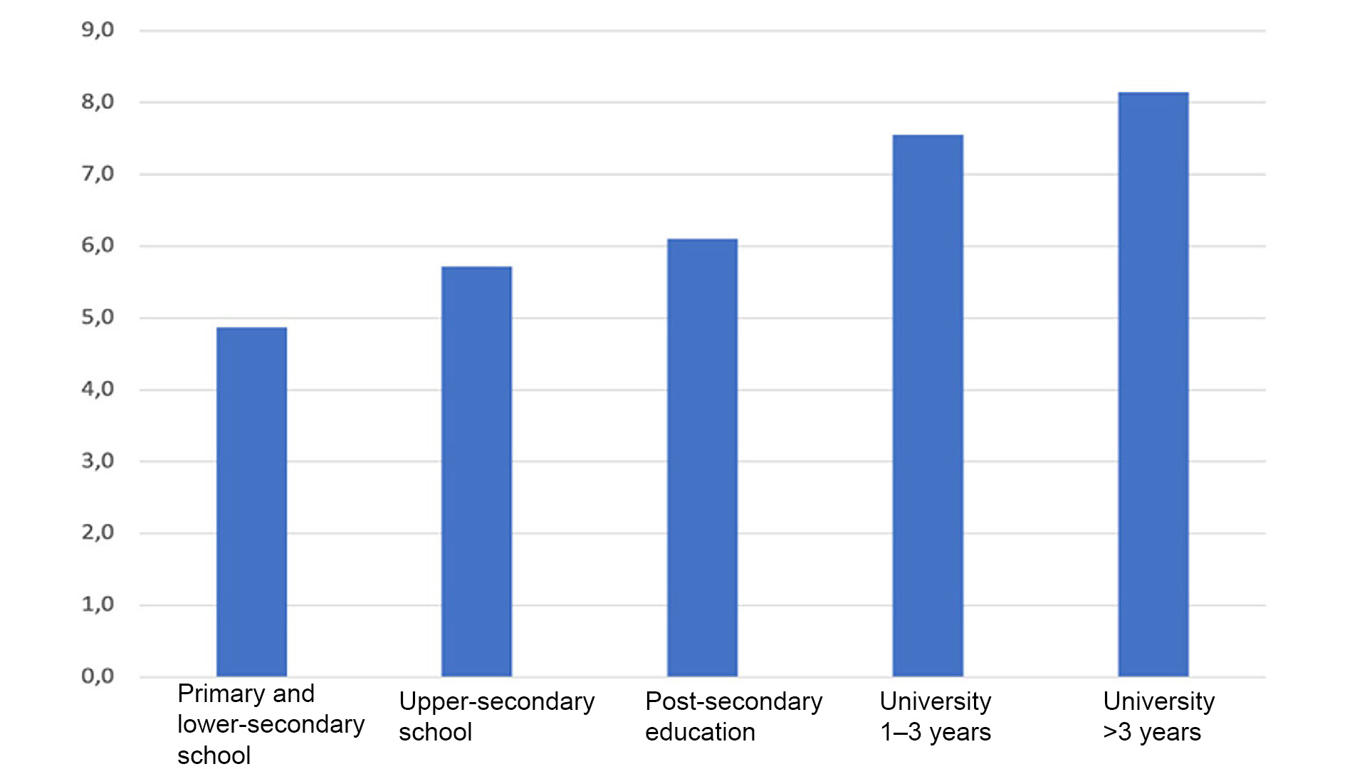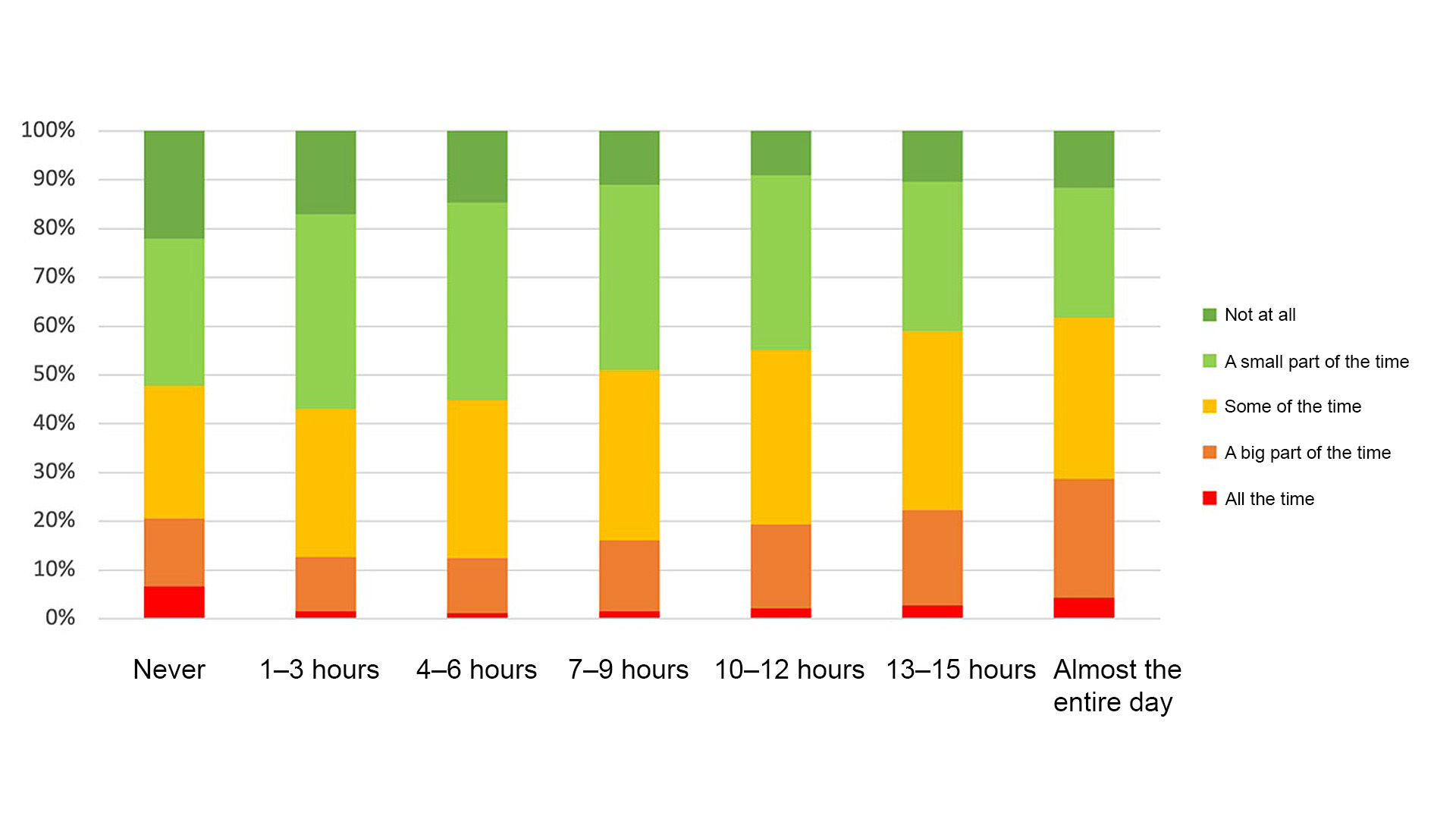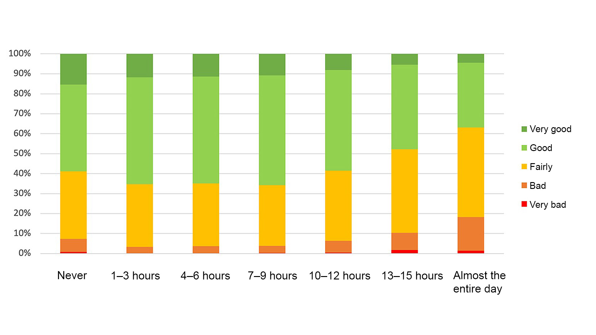 For employees who sit for up to nine hours per day, the self-estimate of general health is relatively equal. But when sitting reaches 10 hours or more, a trend appears where the perception of general health is poorer.