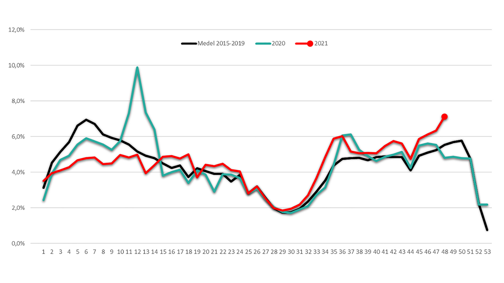 Redan under oktober började frånvaron öka mer än den vanligtvis gör motsvarande tid på året. Efter den naturliga nedgången under novemberlovet har frånvaron fortsatt stiga kraftigt – för att nå årets högsta siffror under vecka 48.