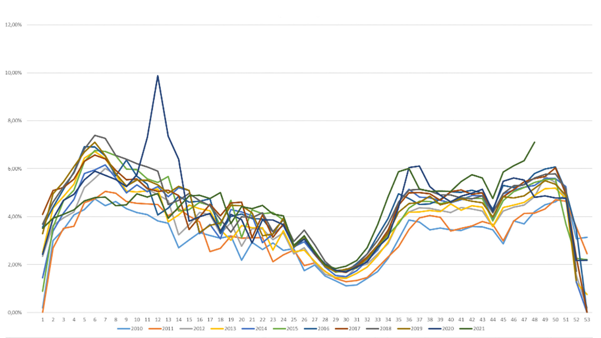 Frånvaroanmälningstalet i procent per vecka. År 2010–2021.