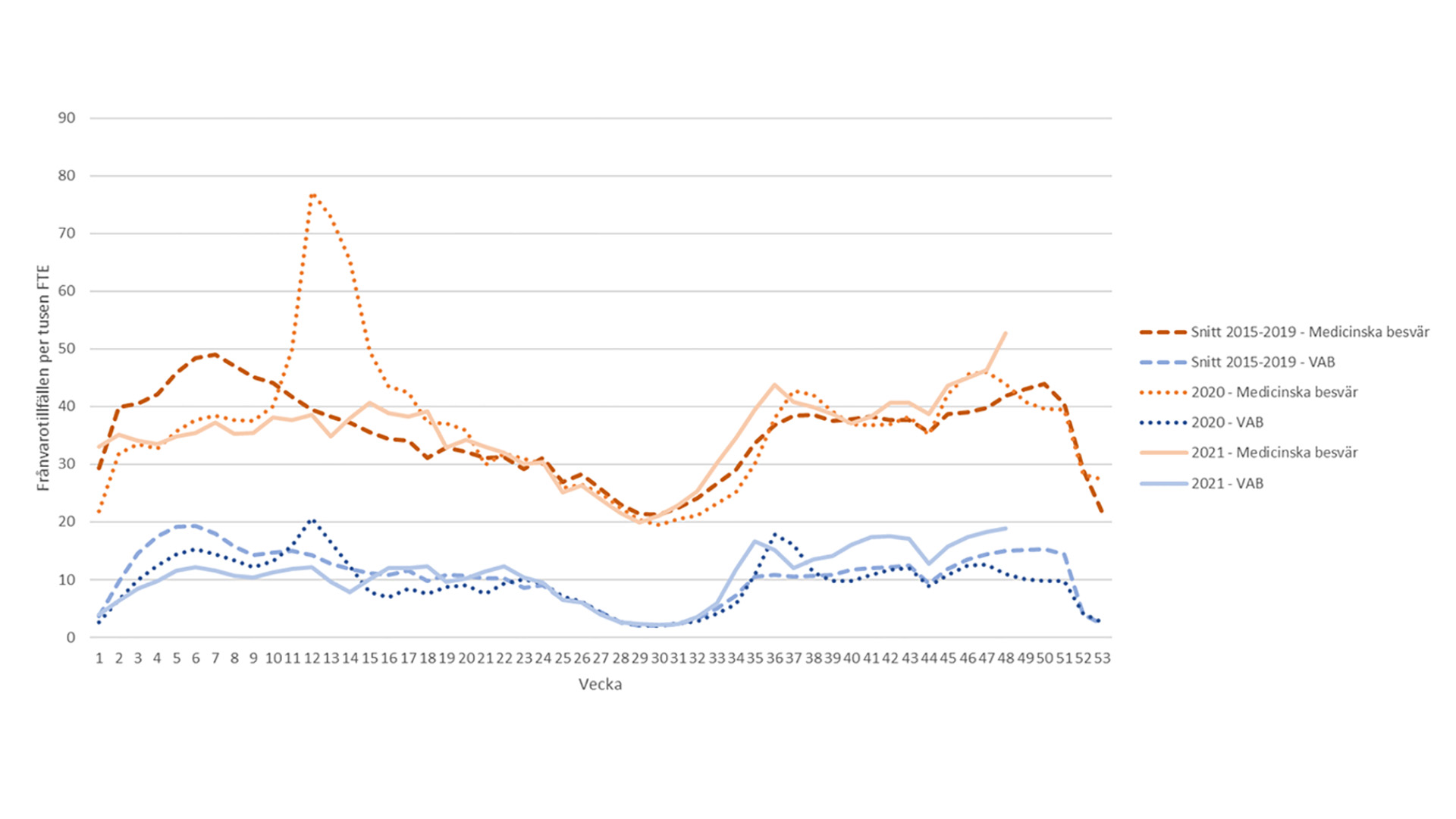 Antal frånvarotillfällen per vecka och tusen FTE (Full Time Employee), fördelat på medicinska besvär och VAB. Övriga orsaker exkluderade.