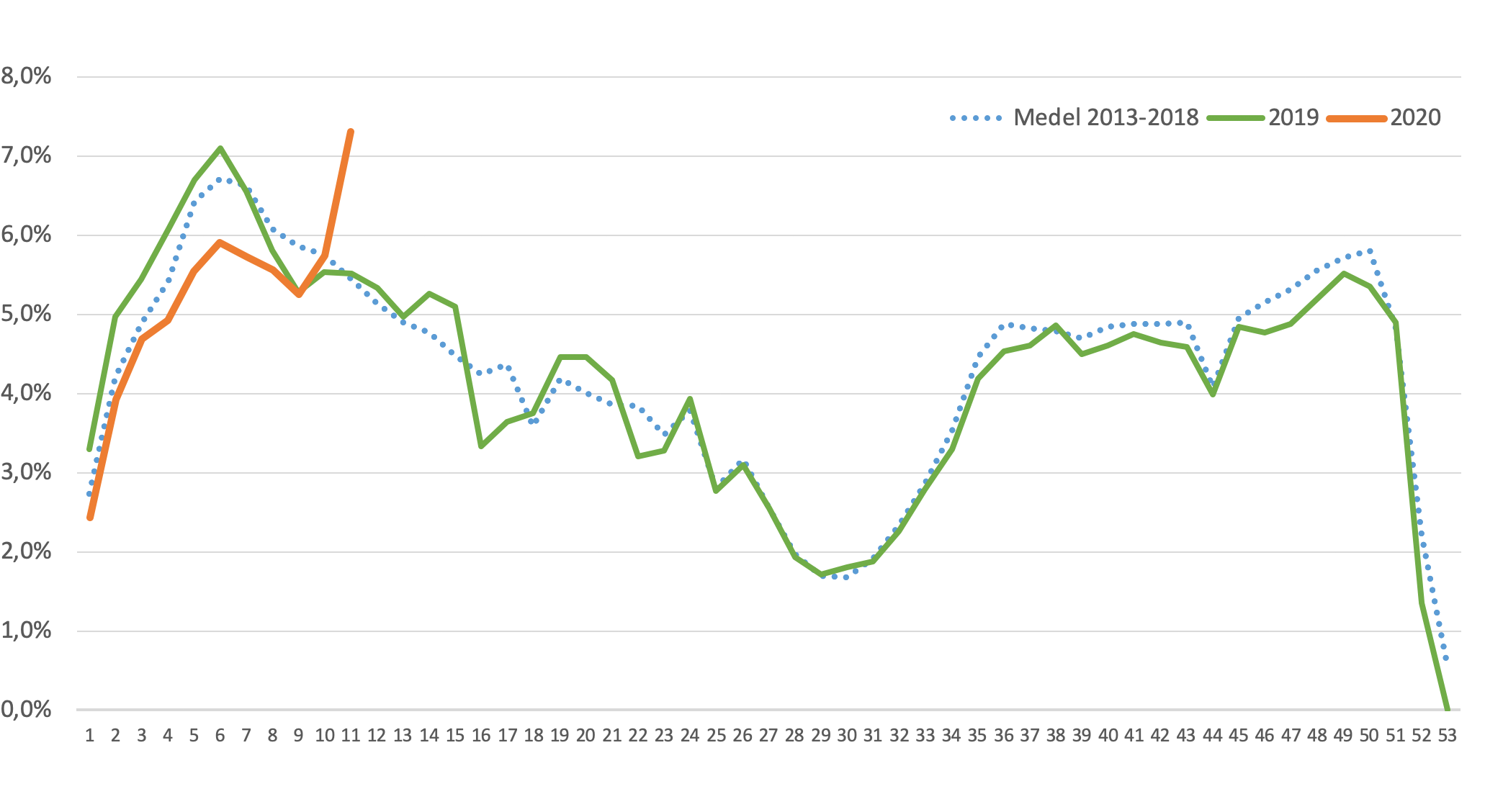 Efter att året inletts med lägre sjuktal jämfört med de senaste åren syntes en tydlig uppgång av sjukskrivningar och VAB förra veckan i statistiken från Previa Sjuk & Frisk.