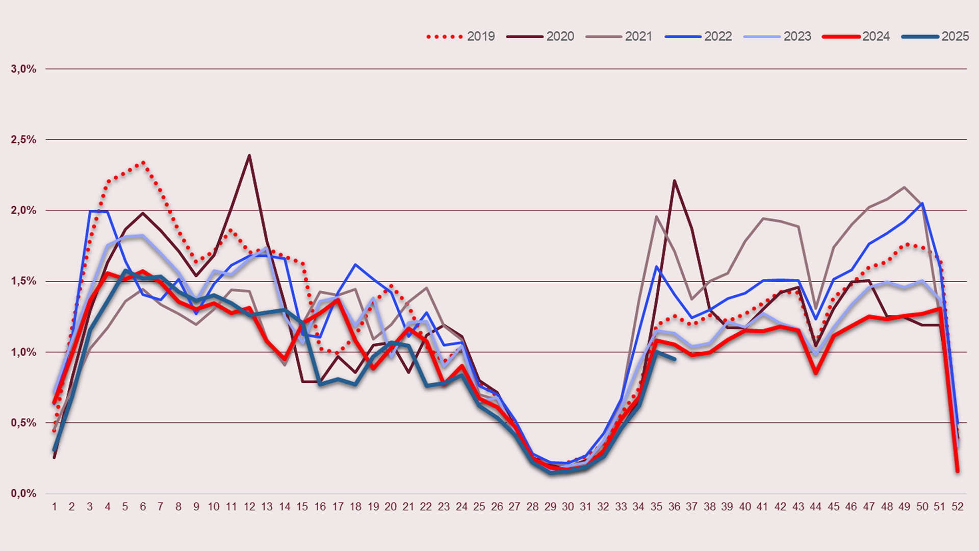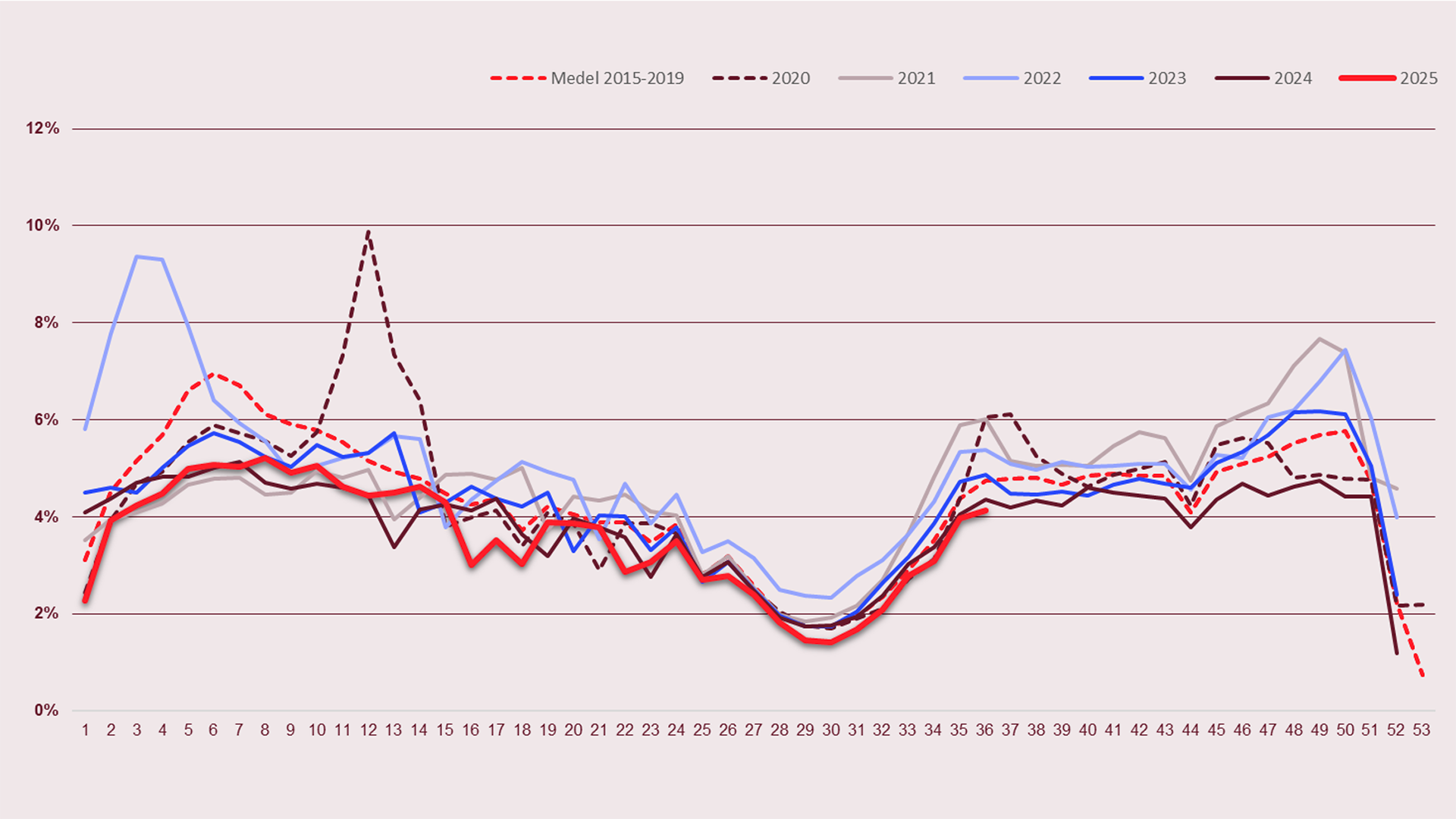 2025-09-10: Som vanligt vid jobbstart och skolstart har inledningen av hösten präglats av en snabb uppgång av sjukskrivningar och VAB. Men nu vänder VAB-kurvan neråt. Det visar färska siffror från Falck Sjuk & Frisk, det mest omfattande och aktuella verktyget för analys av frånvarostatistik i Sverige.