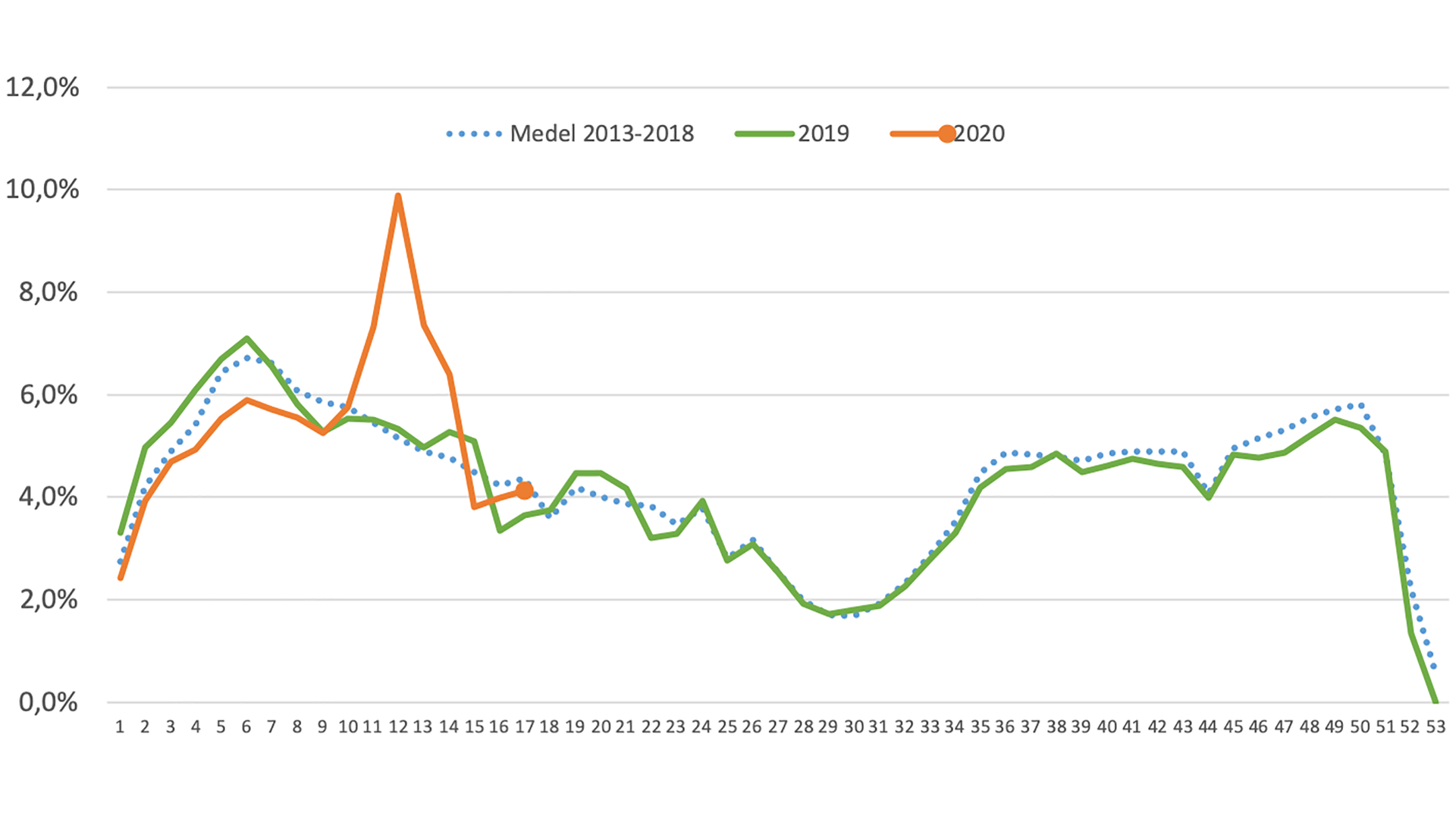 Pressmeddelande 200428: Ökad andel friska under vecka 17 gör att sjukfrånvaron över landet börjar att stabilisera sig, men är fortfarande på en relativt hög nivå. Samtidigt märks en tilltagande oro i riskgrupper. Detta visar Previa Sjuk och Frisk, Sveriges mest omfattande och dagsaktuella statistik- och analysverktyg för kort- och långtidsfrånvaro.