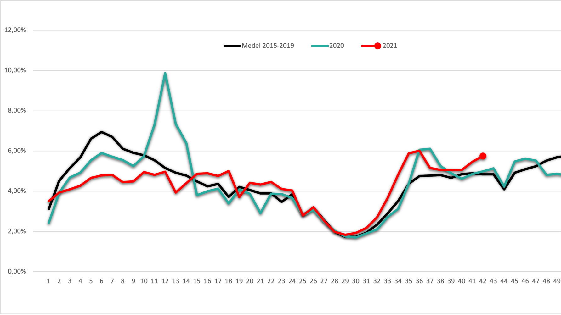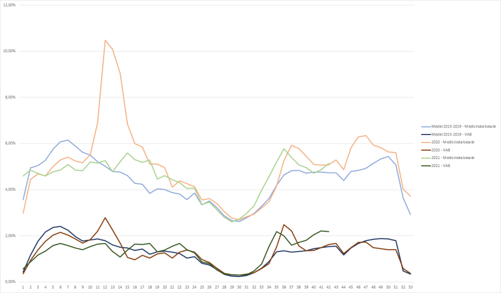 I början av hösten var VAB skälet till den kraftiga ökningen jämfört med tidigare år, medan medicinska besvär låg i närheten av medelvärdet historiskt. Nu har en förändring av den trenden skett. Andelen VAB har trappat av och börjat sjunka, och andelen medicinska besvär har överstigit motsvarande vecka 2020.