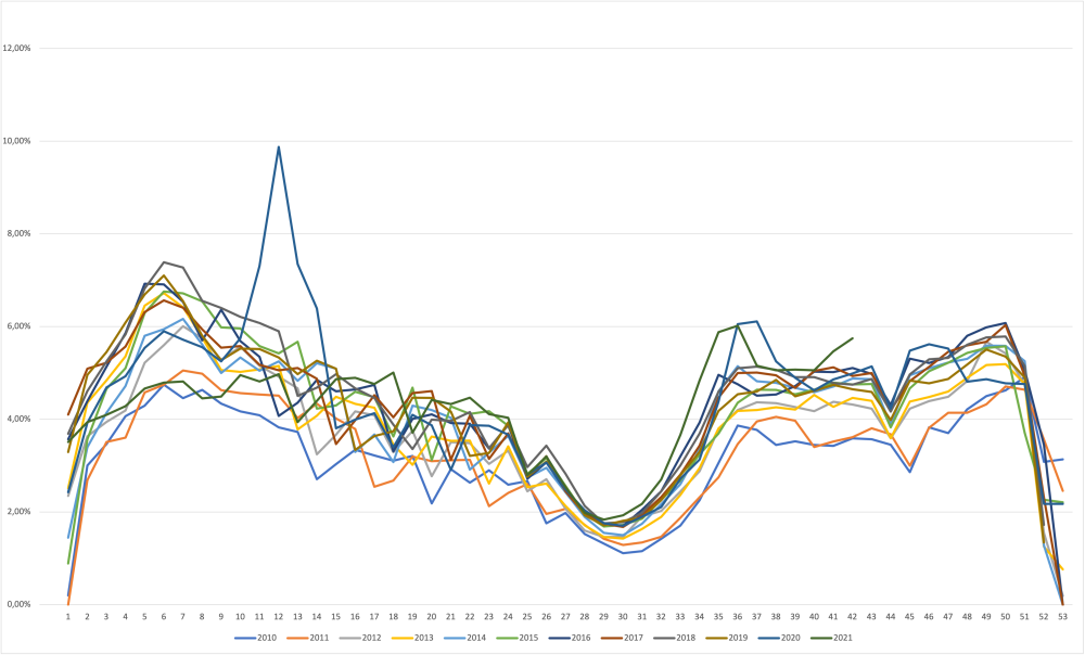 Diagram 2. Frånvaroanmälningstalet i % per vecka. År 2010-2021.