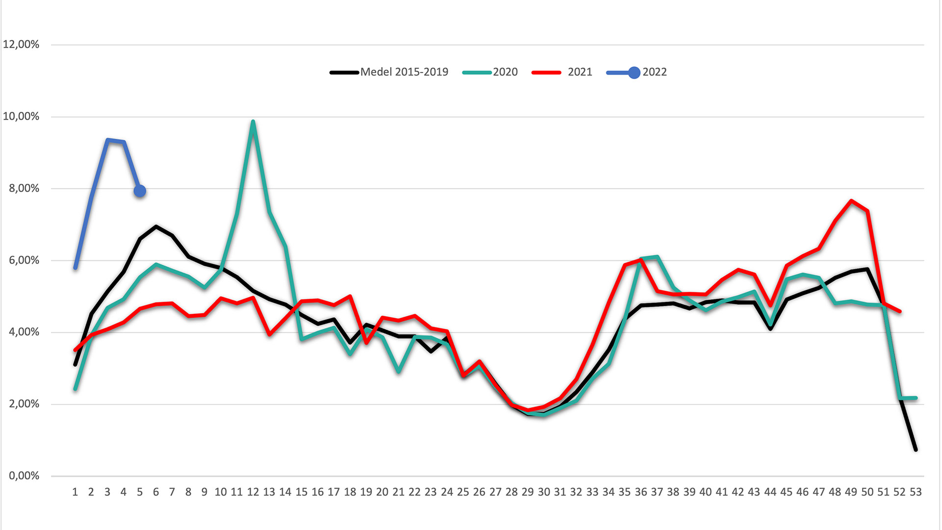 Frånvaroanmälningstalet i % per vecka. Medeltal år 2015-2019, år 2020, 2021 samt 2022.