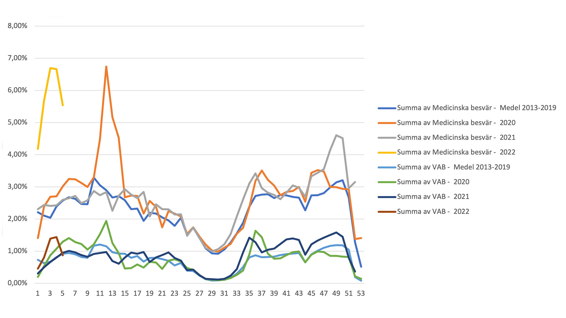 Frånvaroanmälningstalet i % per vecka. Uppdelat på medicinska besvär samt VAB, övriga orsaker exkluderade. Medeltal år 2013-2019, år 2020, 2021 samt 2022.