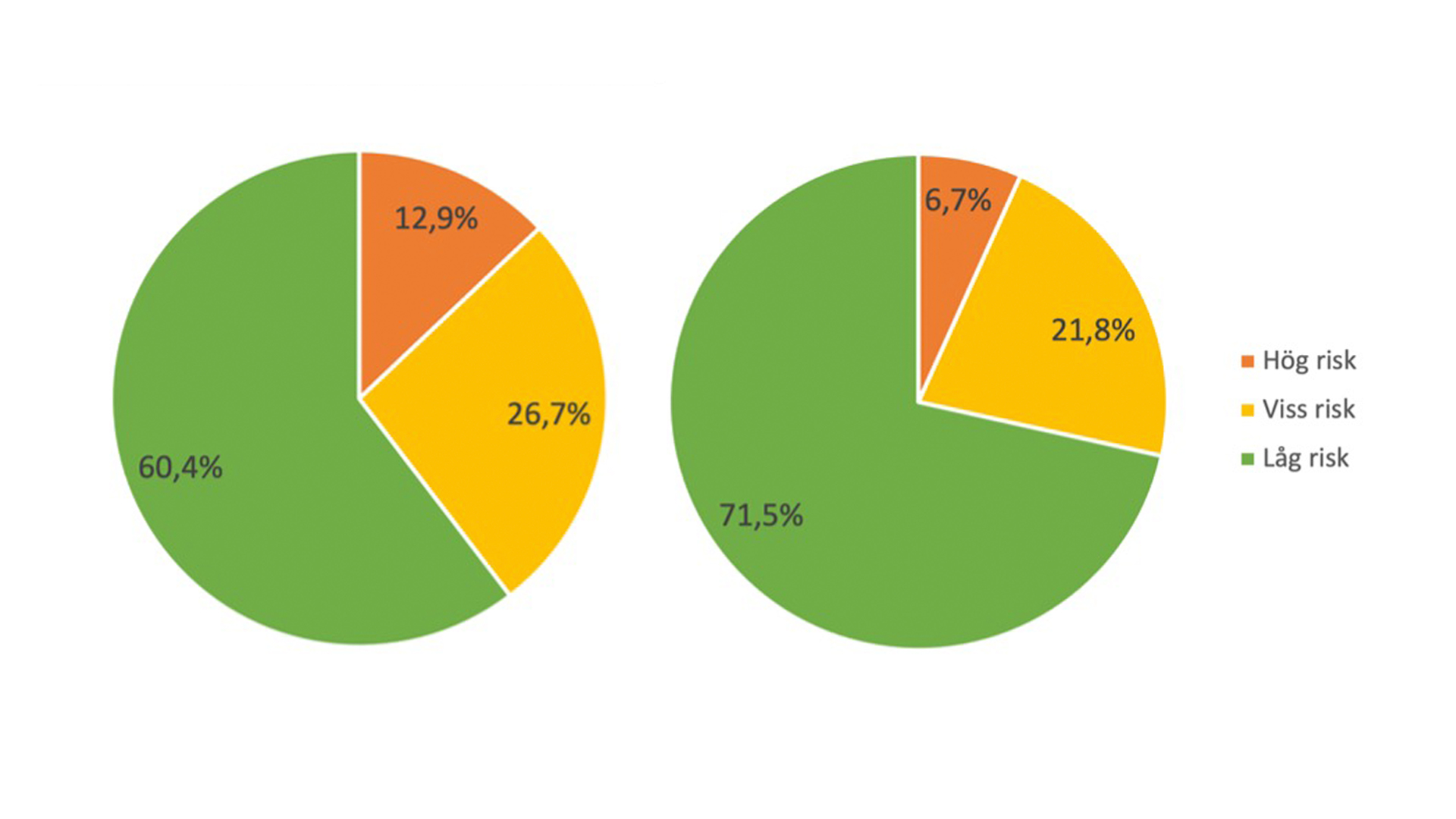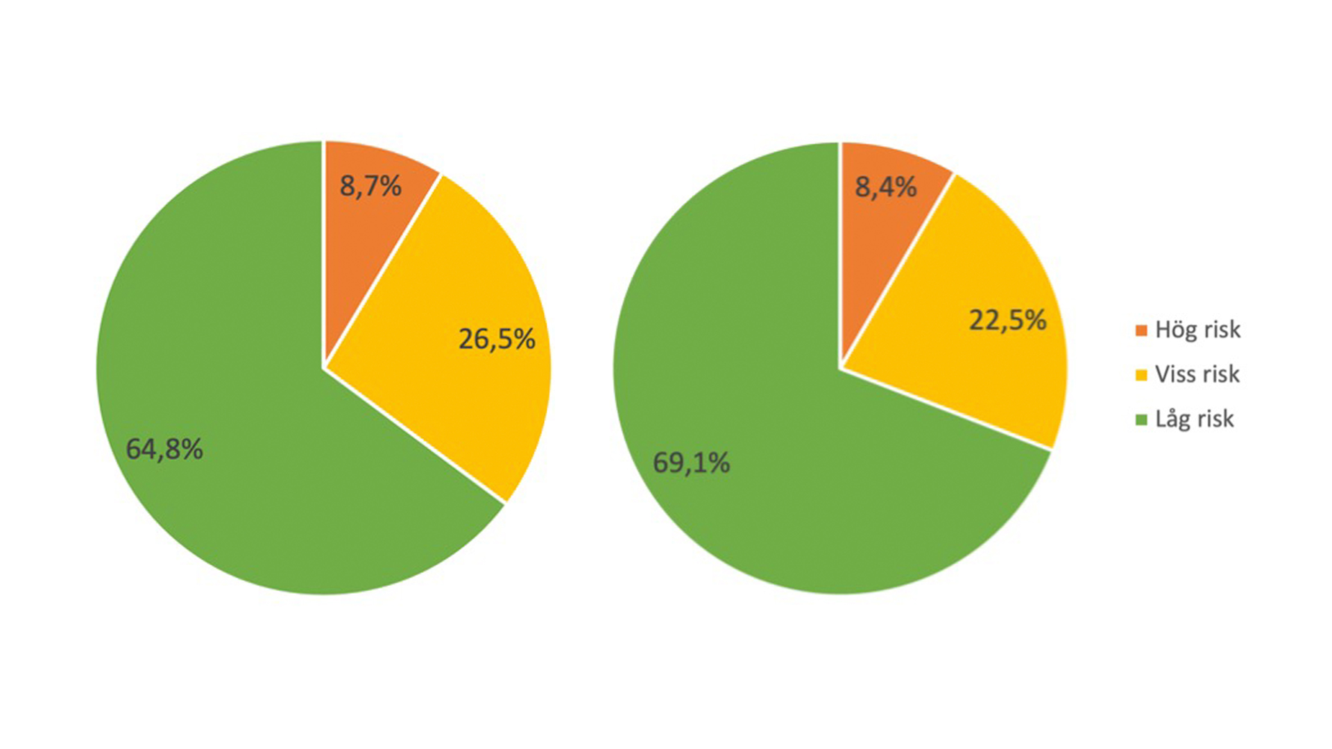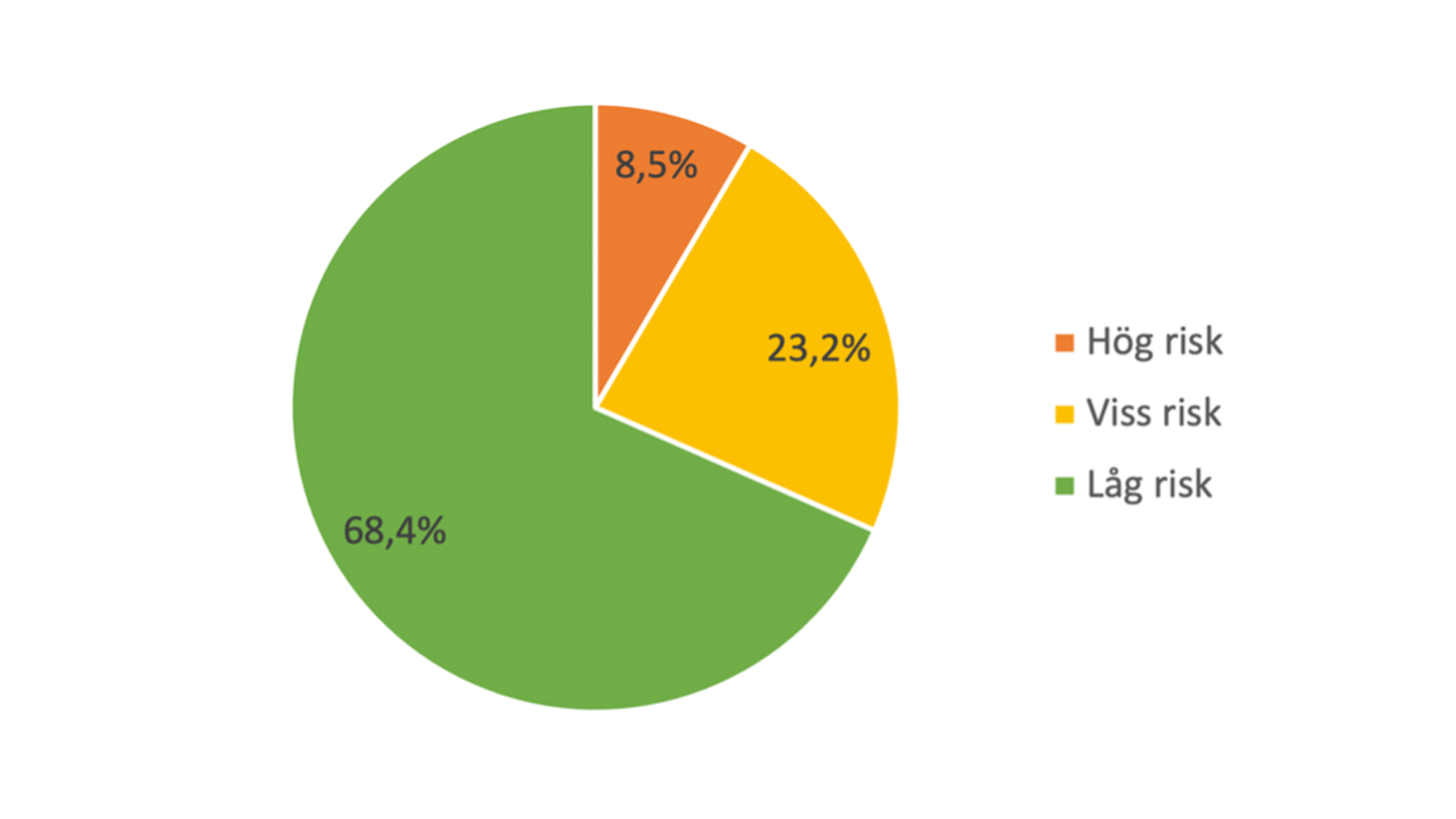 Det är ungefär lika många chefer med underställd personal som medarbetare utan chefsansvar som befinner sig under hög stress, däremot är andelen chefer med underställd personal som är i riskzonen något högre än för medarbetare utan chefsansvar.